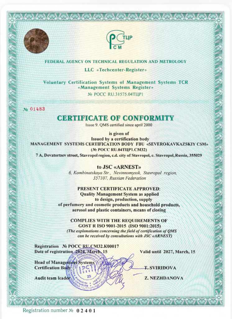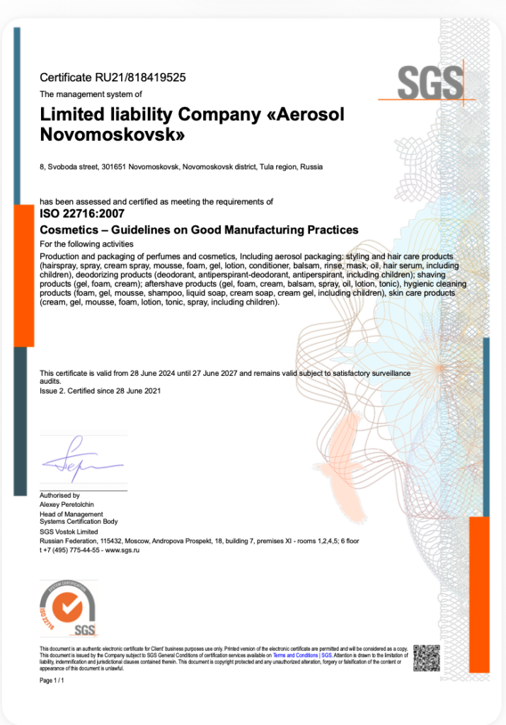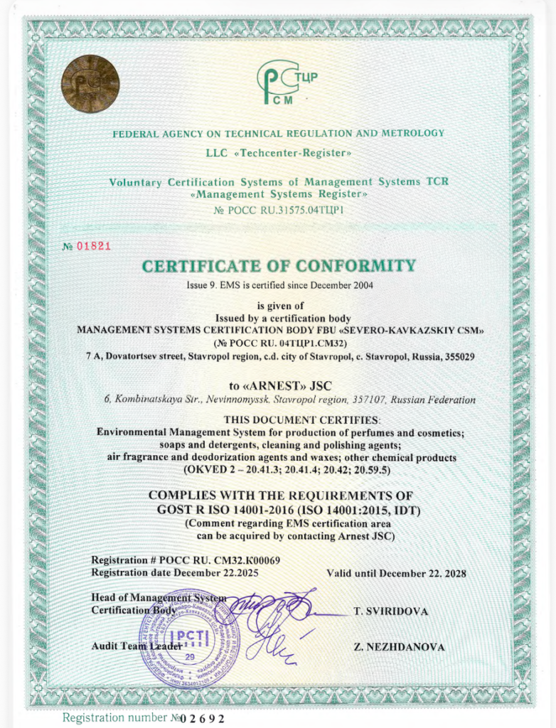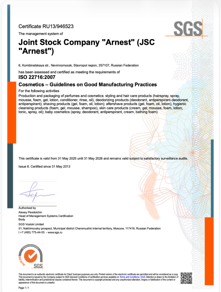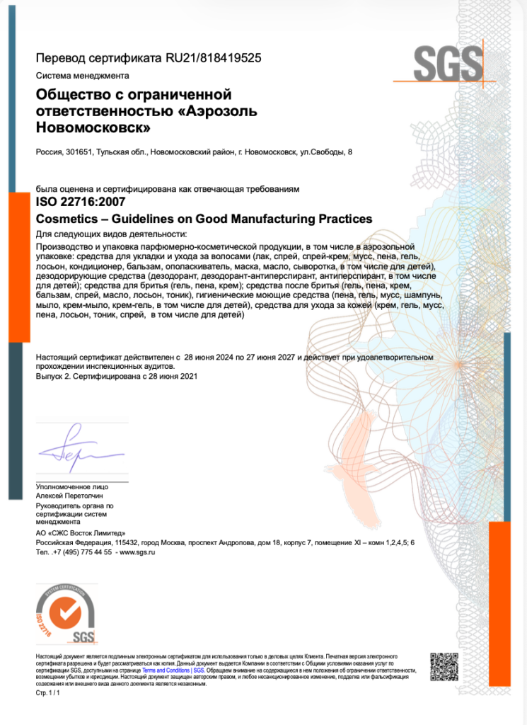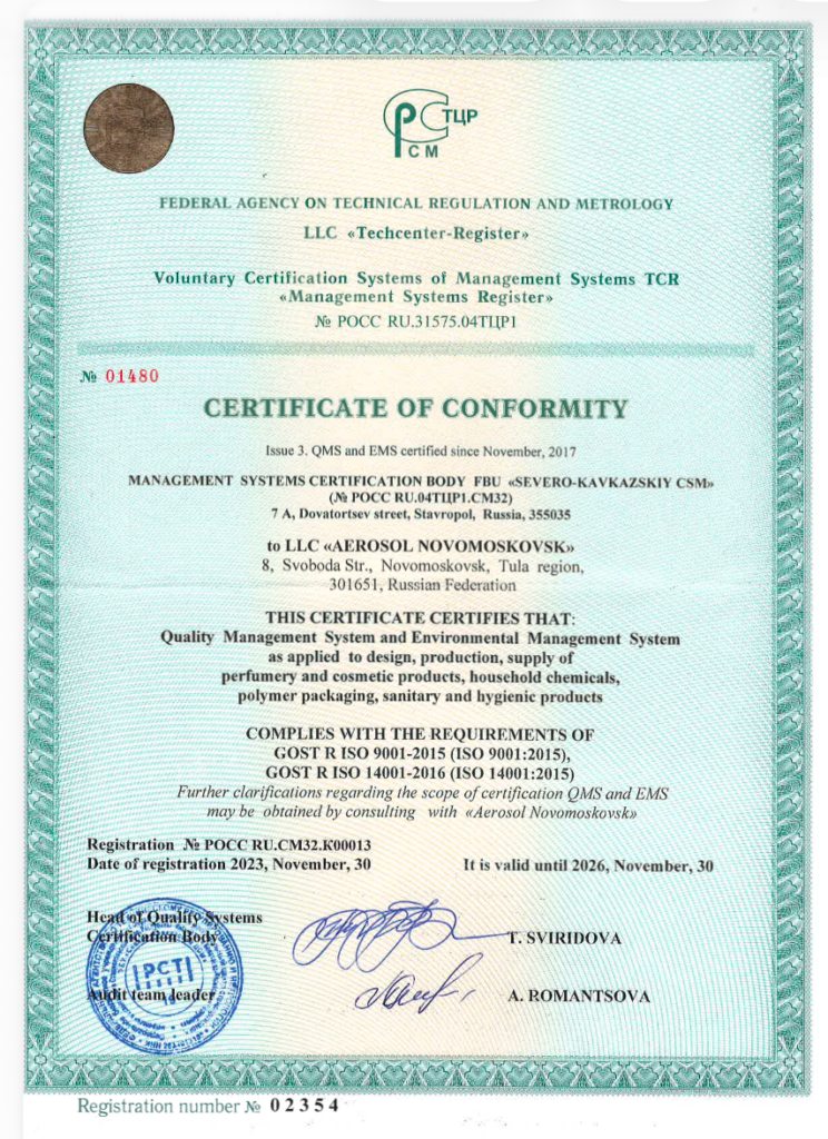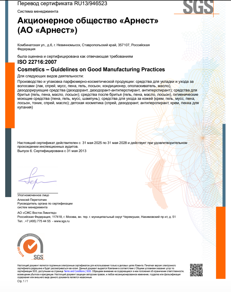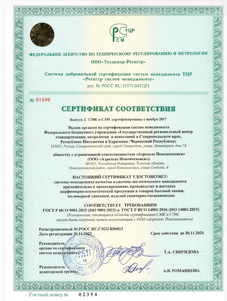 Производство сертифицировано в соответствии с мировыми стандартами менеджмента качества ISO 9001, ISO 14001, ISO 22716:2007